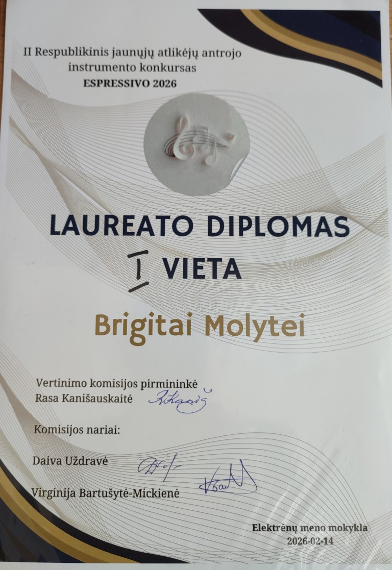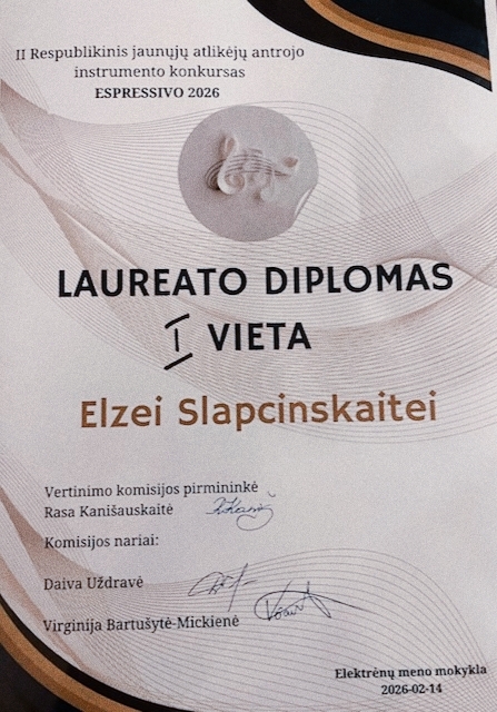 Vasario 14 dieną Elektrėnų meno mokykloje vyko II respublikinis jaunųjų atlikėjų antrojo instrumento konkursas "Espressivo 2026". Jame dalyvavo jaunieji pianistai iš Kauno, Vilniaus, Birštono, Vievio, Elektrėnų, Kėdainių muzikos mokyklų. Labai džiugu, kad konkurse puikiai pasirodė ir mūsų mokyklos mokinės Brigita Molytė (3 klasė) ir Elzė Slapcinskaitė (6 klasė). Abi mokinės laimėjo 1-ąsias vietas, o Brigita dar ir specialųjį prizą už išraiškingiausiai atliktą lietuvių kompozitorių kūrinį. Mokines konkursui paruošė mokytoja ekspertė Neringa Dainelytė.